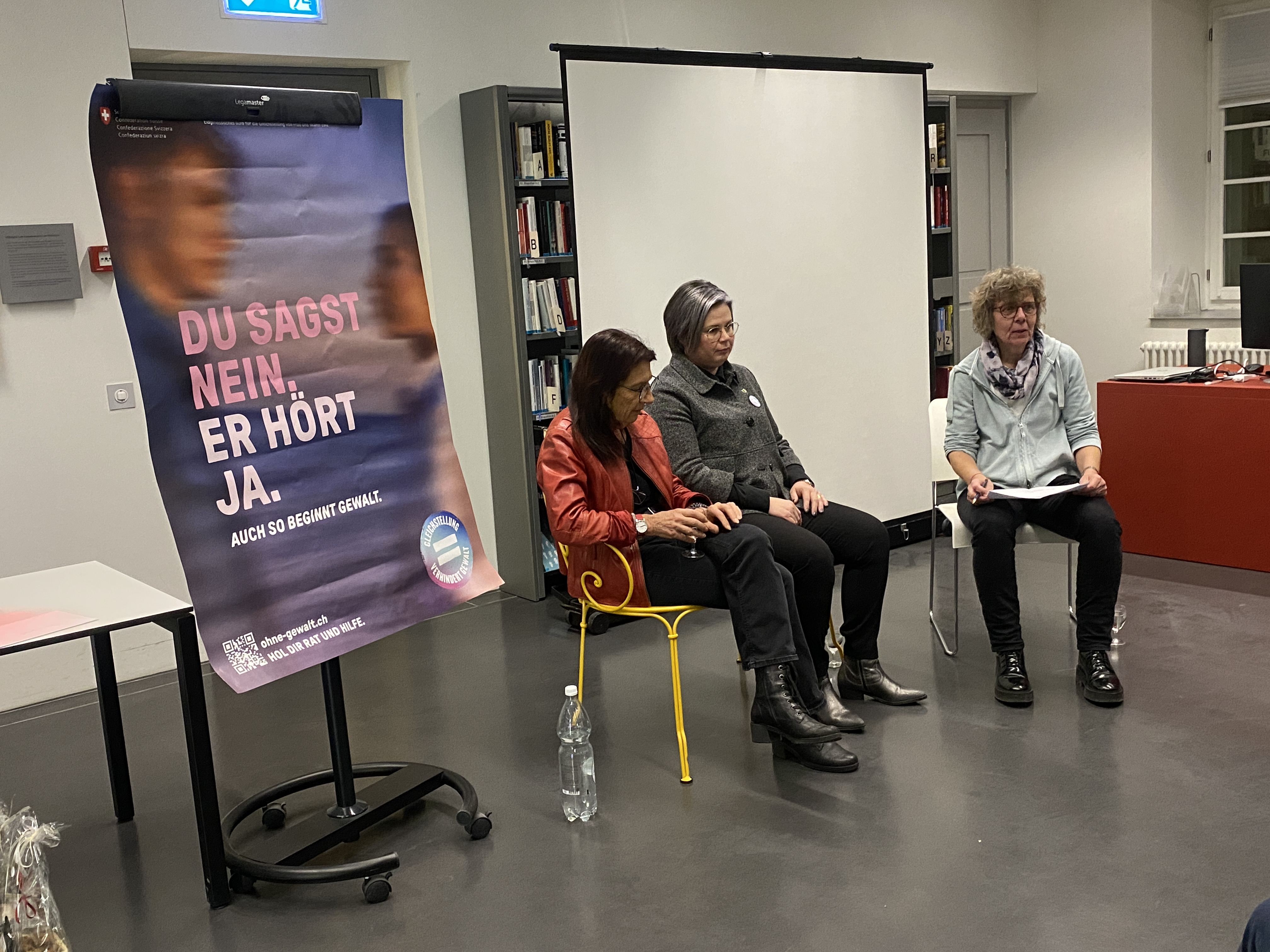 Spannende Kurzdoku über drei Betroffene, interessantes Referat von Silvia Vetsch, der Leiterin des Frauenhauses St. Gallen, und am Schluss eine Diskussionsrunde mit Silvia Vetsch und Cornelia Kunz, Stadträtin aus Wil, geleitet von Silvia Ammann. Ein spannender und lehrreicher Abend!